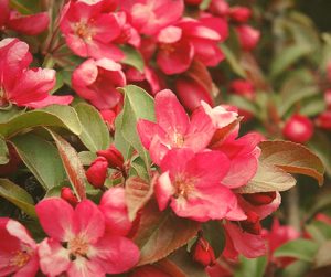 Flowering crabapple will produce a mass of showy spring flowers followed by small bright red crabapples (non-edible) that will remain attached to the tree branches and gradually whither as the season changes into fall. Flowering crabapple will reach a mature height of between 15-25 feet. Chose a disease resistant variety and plant in full sun in well drained soil.